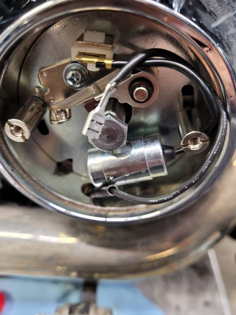 Atomic Shovel update: Got tons done again today. Put the battery box back, and got new starter relay in, cleaned up all the wiring. I did a bunch of other little stuff, and then started messing with the points. Found some videos, read the service manual, went back to the videos, and just did one step at a time till I got it done. These points are dumb tho. Couldn’t figure out for the life of me how to attach the damn power wire to the condenser. There was no obvious way. I spent about 20 minutes just staring at it, poking at it, staring some more… made a few phone calls. Not much help. Finally I figured out that this little brass piece gets shoved in there and the wire attaches to THAT! What the fuck. Really dumb. But ok. Meanwhile Chris Tribbey called me back and verified that’s what needed to happen. Hooray.