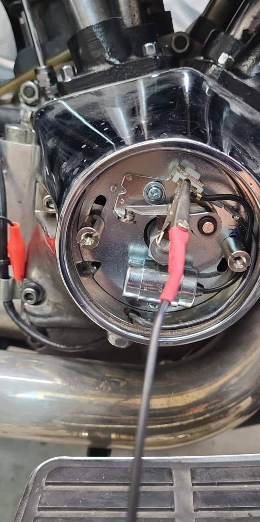 Atomic Shovel update: Points install complete! Thanks in no small part to Bill Daneke. I realized last night that I got sidetracked and never set the timing! Squirrel! So this morning I started with that. Bike back up on the bench jack, timing plug out, spark plugs out, found the timing mark annnnd when I went to set the timing, the plate wouldn’t clock far enough. Sumbitch.
