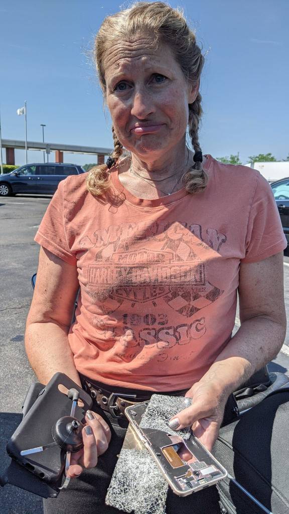 I pulled to the shoulder, with Marjorie pulling in behind me – she had also witnessed the spectacular dance across the highway. I hopped off the bike – leaving it running because it actually was, for the moment, running perfectly, and I didn’t want to jinx it by turning it off – and walked back to where the phone, or the pieces of it were lying, smashed and sad in the middle of the highway. I collected the biggest pieces, and walked back to Marjorie.