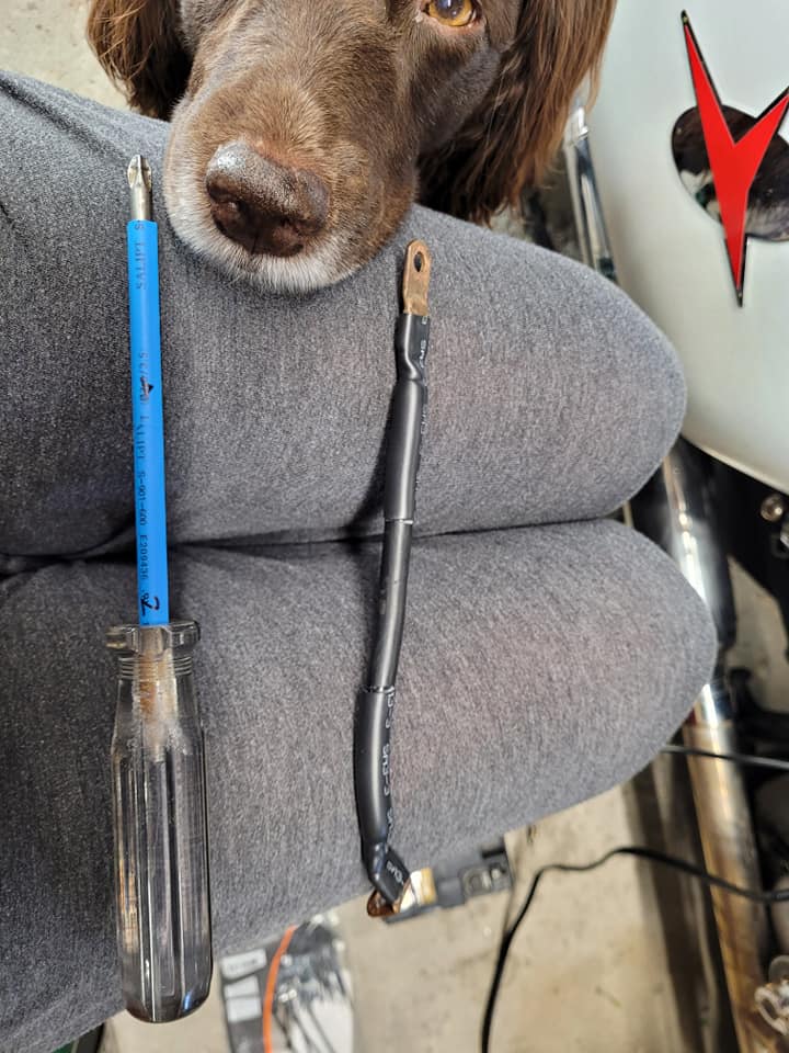 Then I was ready to install the spanky new, freshly charged battery. What a colossal pain in the ass. It took me an hour of struggling before I finally got that bastard in the bike with the cables tightened down. At Kiersten’s suggestion, I slipped some shrink tube over my screwdriver because I have never put a battery in that bike without arcing on the frame, which makes me jump out of my skin! With her little trick, I got that battery in with no fireworks. Major win.