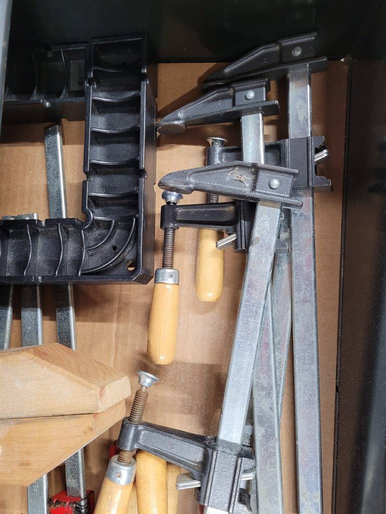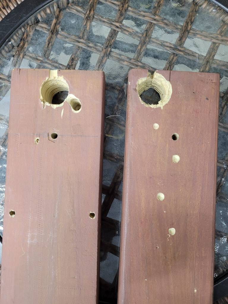 Step 2 again. The next day: I got that sumbitch tailgunner light back on. Used a little carpentry trick. Drilled a hole in a 2×4 so it would slip over the glass lens and rest on the beauty ring. Drilled another hole in another 2×4 so it would slip over the pointy decorative part in the back of the housing. Used a bar clamp to draw the two boards together, putting even pressure on the beauty ring. DONE.