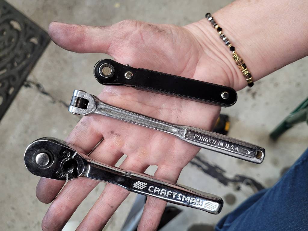 The winner was the slender, non-ratcheting socket handle in the middle. Who carries that on a bike? I do now.