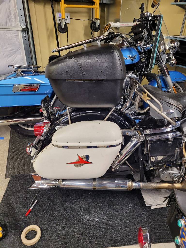 My friends Chris Bowen and Linda Kish Bowen gave me a set of super-cool, perfectly Atomic mud flaps for the 74. Seeing as I’ve had quite a lot on my plate, I hadn’t had time to install them, but I wanted to make sure they got put put on the bike before I embark on Chix on 66 in June.