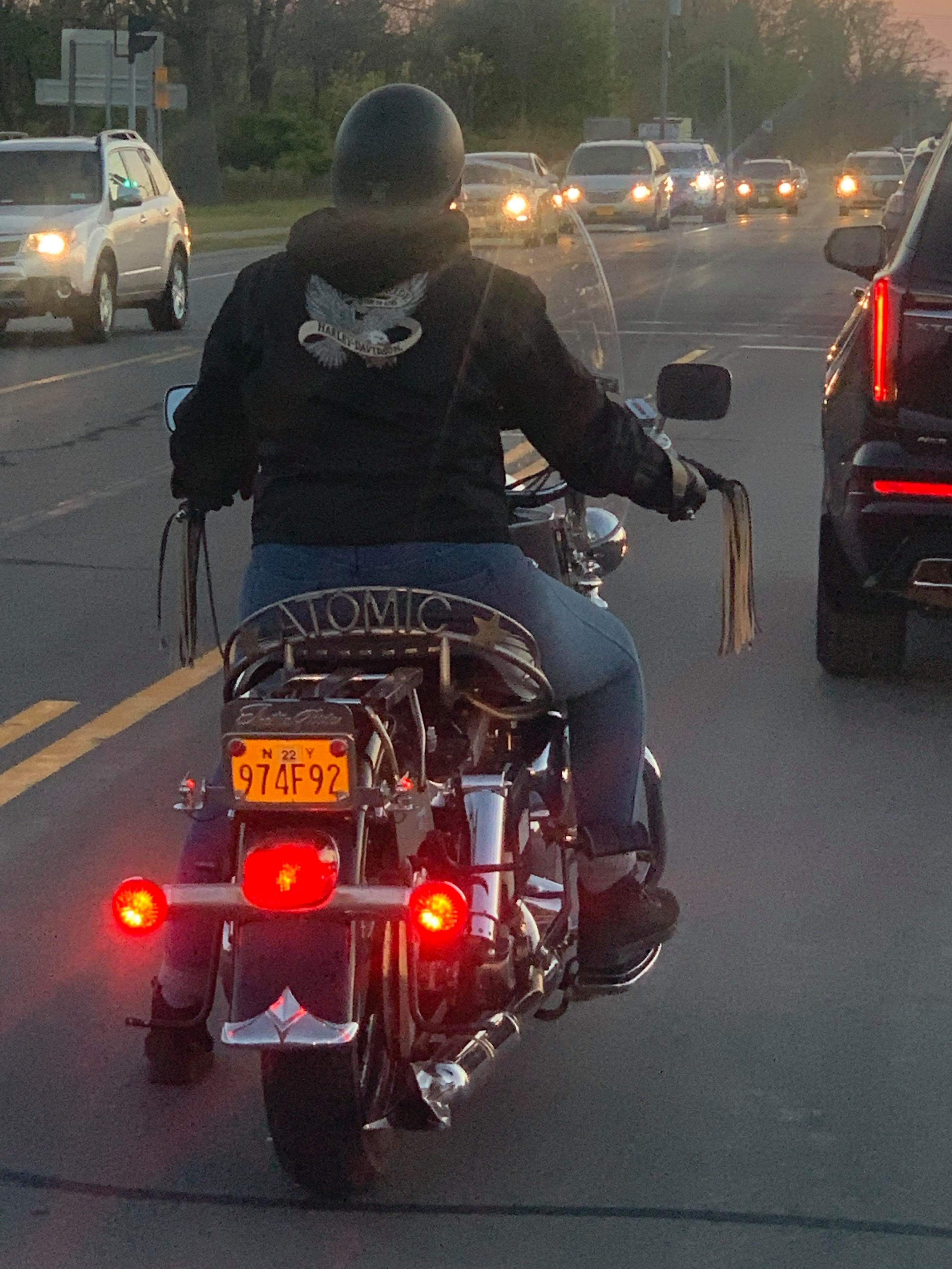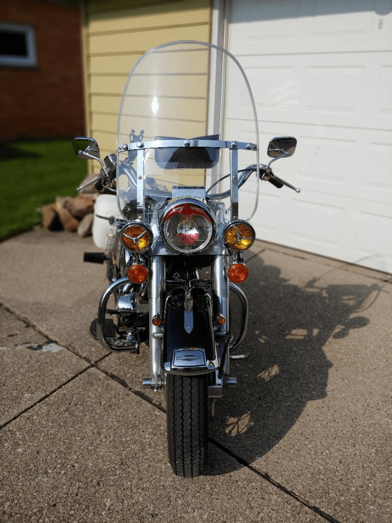 Day 9: Final day of the Atomic Shovel adventure: The last push home. It was cool when I left Lancaster, OH for Lancaster, NY. I gave the bike a once-over at the hotel, and nothing else looked like it was going to jettison itself off – although, nothing ever does, and all of a sudden, something is just gone. Regardless, I do my once-over, and I believe I am good. However… and I have already learned that there is ALWAYS a ‘however’… It was in this moment that the starter button no longer worked. I knew it was coming. Just a matter of time. So I had to use a screwdriver to bridge the posts on the solenoid mounted under the battery. Thankfully, it is exposed and easy to get to. So I started the bike, and while it was warming up, I checked everything once again. Apparently distracted by this situation, I didn’t think through the ambient temps, and didn’t dress warmly enough, so I ended up stopping for gas sooner than I planned so that I could put my heated jacket on. The rest of the ride was very comfy. In fact, the final 400 miles of the trip were mostly uneventful. Mostly. The bike ran great in the cooler air, and the route had beautiful scenery, charming small towns. However… yes, the however again… riding through this one small town, my GPS took me through a section of road paved with red brick. There were deep ruts from car and truck tires, and some places there were these weird uneven swales. The ruts were fairly easy to see, so I didn’t have any trouble with those, but one of the swales caught me off guard. I hit that thing HARD. I wasn’t going fast – I couldn’t – it was a residential street, I was heading uphill, and the bike doesn’t pull hills all that well – I think I was maybe doing 25 at most. But I hit that swale, and my entire self was off the seat – airborne! To the point where it pulled the plug from my heated jacket. I am pretty sure the bike lifted as well, but the front end smashed so hard that it bottomed out the front fork, which meant the tail of my rocket hood ornament smashed into the bottom of the nacelle. When I stopped later, I checked the front end, and indeed, the rocket’s tail is cracked. So I will add that to the list of repairs. Aside from that, I made it home, the shovel made it home, and our Atomic Adventure ends. Despite, or perhaps because of all the shovel’s tantrums, I had possibly the best time ever. I would do it again in a heartbeat, and in fact, I’ll put the shovel on the lift, and start working through my list of repairs, so that I CAN do it again… There are a couple runs next season that sound amazing, and would require a cross-country trek. Thinking I’m IN!