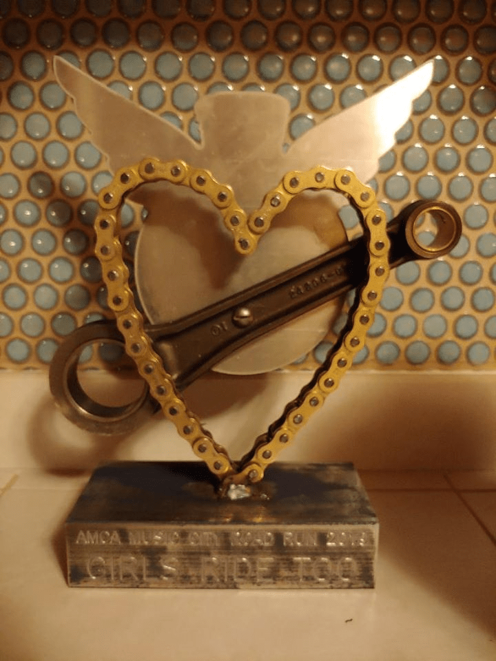 I’ve saved this news since Friday. I wanted to think about what it really means, and how to share it. I hope I do this honor justice. At the final banquet Friday night, they gave out awards for various accomplishments – oldest bike, oldest rider, youngest rider, longest distance, and a few others. These are standard road run awards. But this group added one. It is called “Girls Ride Too.” And it was to recognize the woman they felt best represented those of us who ride these old bikes. There were more women riders at this event than the previous road run I attended. I did not get to meet or talk to all of them, but there were women riding kickers – knuckles, pans, Indian Chiefs, etc. There were women on evos, and me on my shovel. There were other women who chose to ride two-up with their husbands for the meet, but who ride their own bikes normally. Out of all these incredible ladies, they chose to honor me with this first-time award. I am brand new to the vintage bike world, and these people have embraced me in a way that I could never have anticipated. There is a long and rich history of women riders, going back to the beginning of motorcycles as a mode of transportation. Many women riding today can, and do work on their own bikes. But the fact that the Music City AMCA Chapter felt that I represented these women is beyond humbling. I hear so many women riders (of modern bikes) comment that they are always dealing with ridiculous comments from men. I wish that they would come with me to a vintage event and see how REAL men feel about things. All these guys care about is that these old bikes are on the road, running, and that the knowledge about them gets passed to the next generation. This is why I get to learn so much – all I did was show some interest, and these guys just open their brains and dish out whatever I need to know. So, I cannot thank the Music City chapter enough for the honor, and I hope to see more women embrace this amazing culture of vintage bikes. I post frequently about my adventures working on my shovel, and part of the reason I do this, is because I have a lot of women rider friends, and I hope that maybe seeing me tackle this, someone else may get inspired and try it too. I cannot describe the feeling I get every time I get on that bike and ride it, knowing the work I’ve done, knowing that if something does break, I am not lost. If I can’t fix it, I can give a pretty good go at diagnosing the problem. The AMCA wants to see more women as riding members, and there is no reason why that should not happen. After all, internal combustion IS the ultimate accessory!