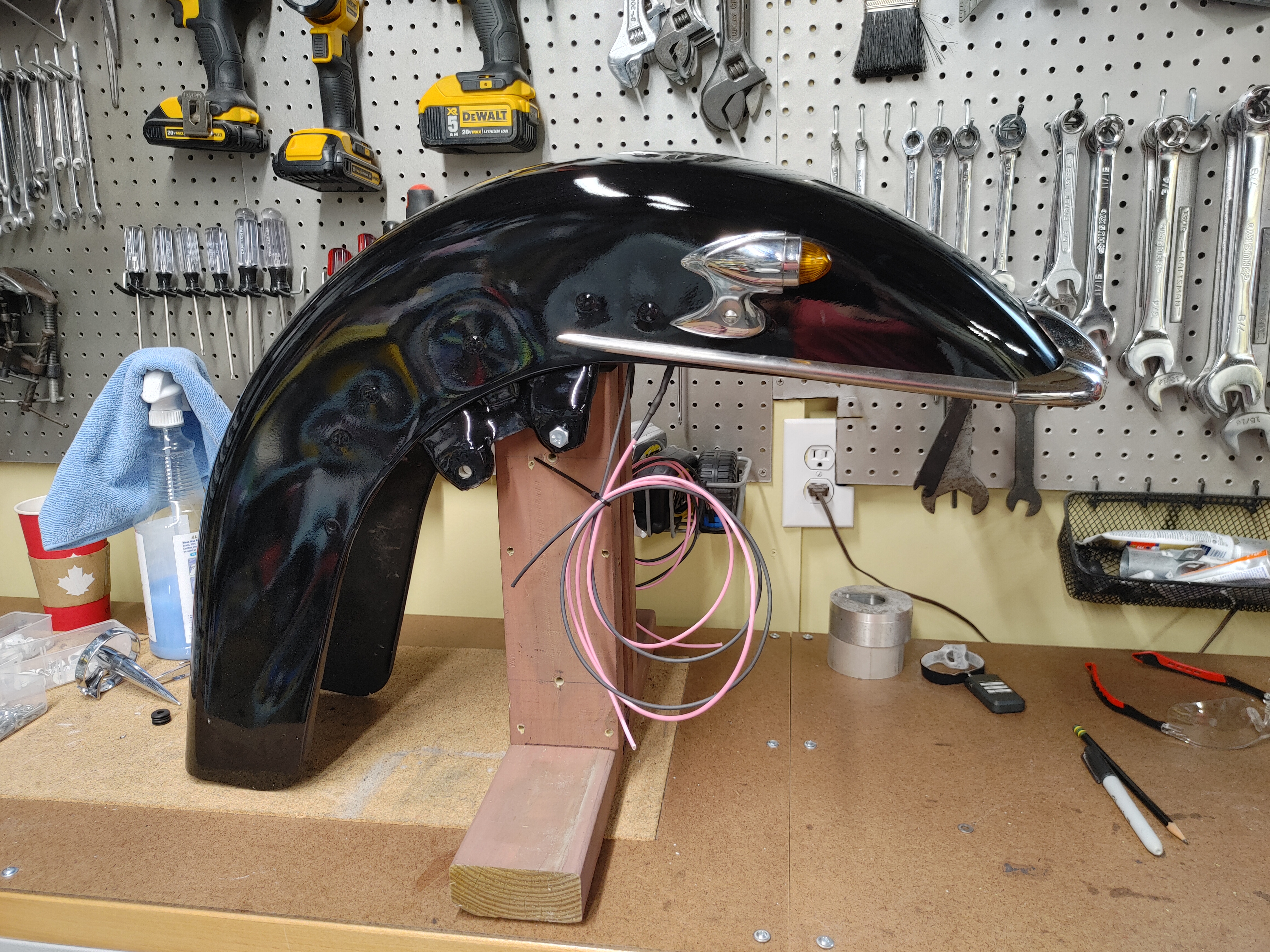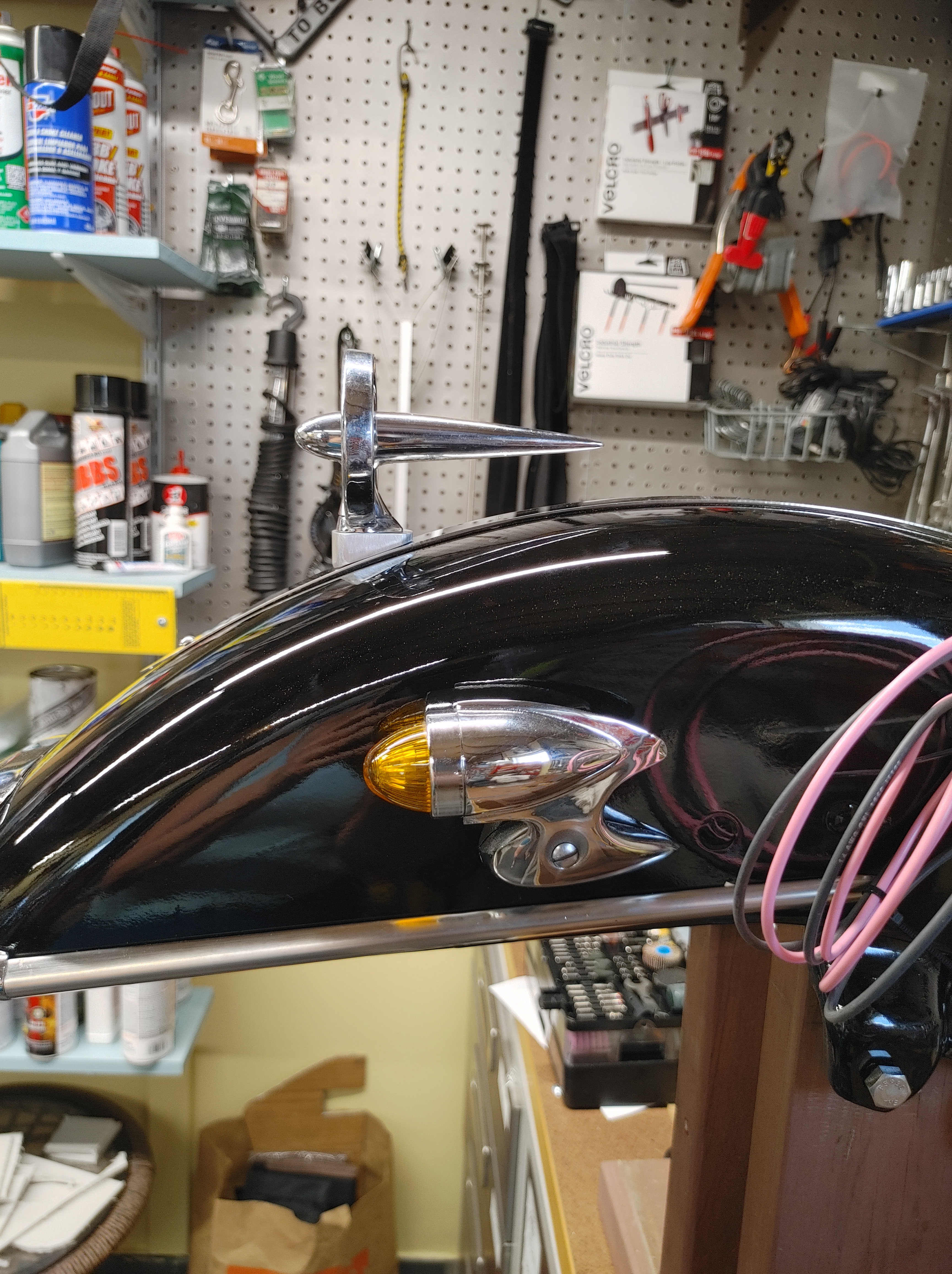 Atomic update: spent some quality time with the front fender today. I pulled it off for repair and repaint last year – thank you Todd Wilcox – so I have to put all the doodads back on it. It doesn’t seem like I got a lot done today, but getting the tailgunner lights reinstalled took some time. I tested them before I went too far. They are single wire, meaning the housing provides the ground, but when I tested them, nada. Even though they will probably work once the fender is bolted up to the bike, I didn’t feel like waiting to find out that maybe I still didn’t have a solid enough ground. So I just ran a ground for each light anyway. I took my time figuring out how and where to run the wires, but I got it done. Hooray. So I am about halfway done with fender duty.