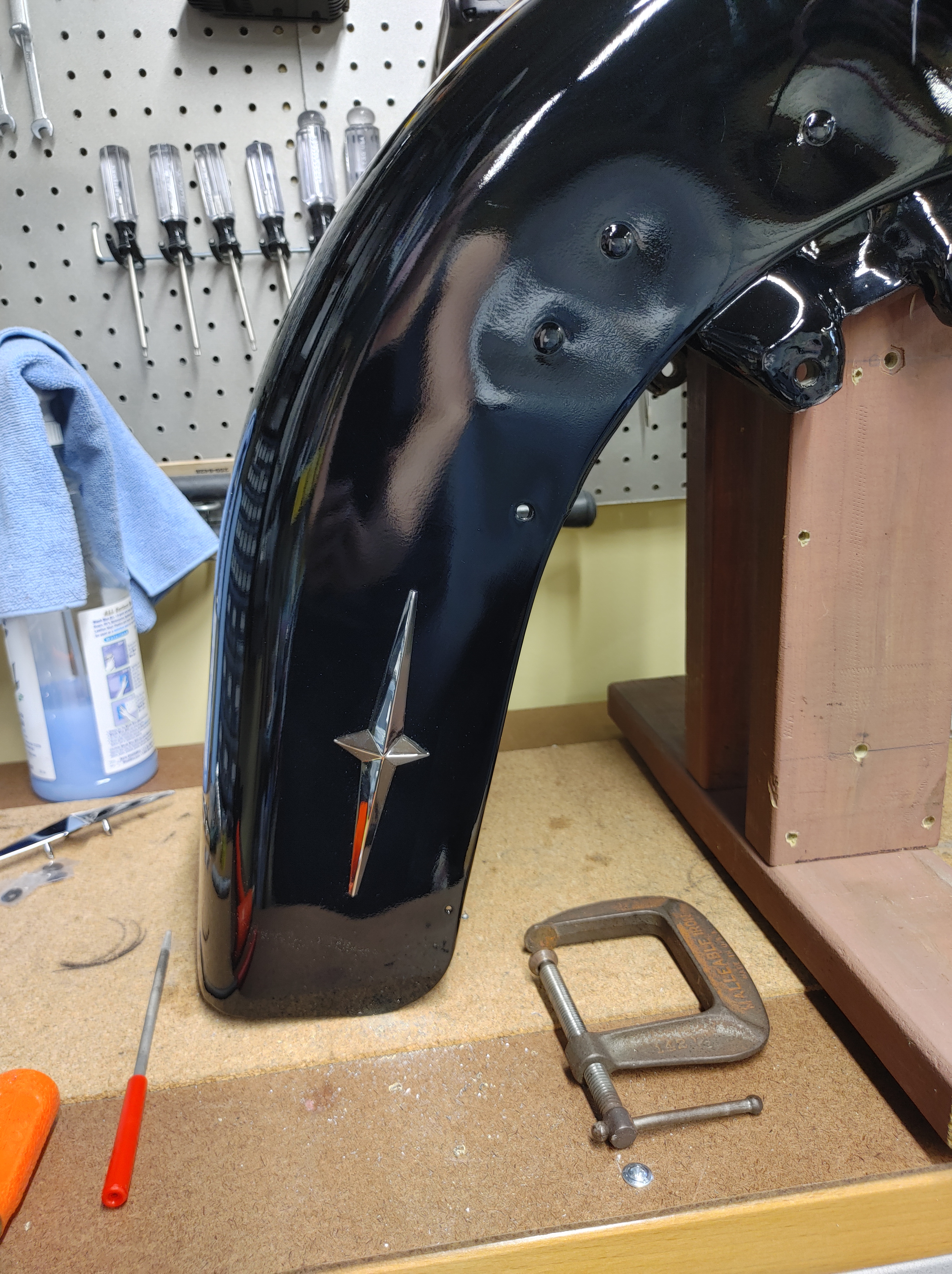 A little more work on the front fender. I am almost done, but I need a 20-degree wedge, 1″ wide to mount the fender ornament sitting on the bench beside the fender. Dang it. I had a little wedge of aluminum but I tried getting fancy with it, and screwed it up. Twice. So I will have to wait till I can get that wedge made before I can finish the fender completely. I did get the stainless strip installed though. Sooooooooo close to done….