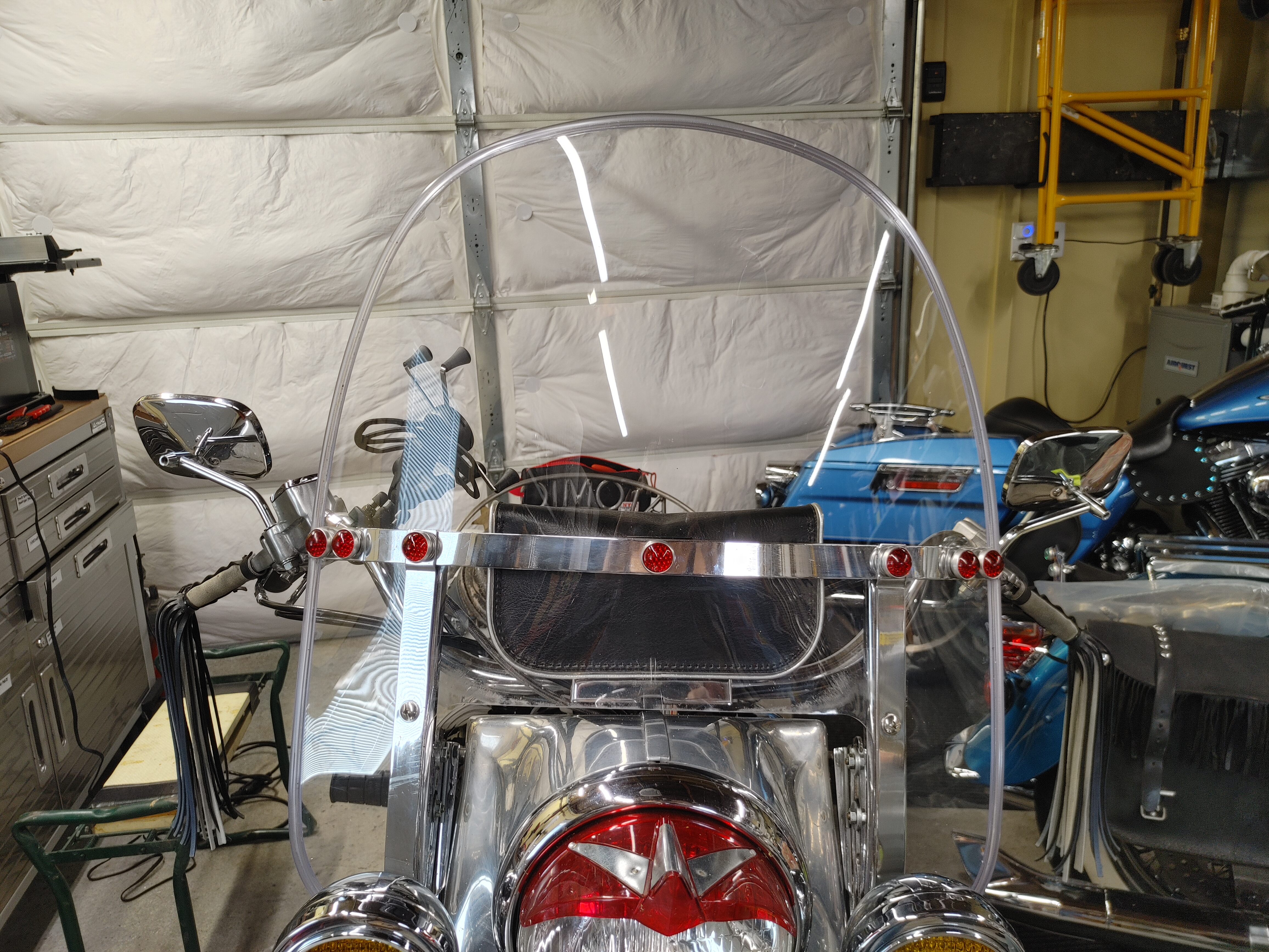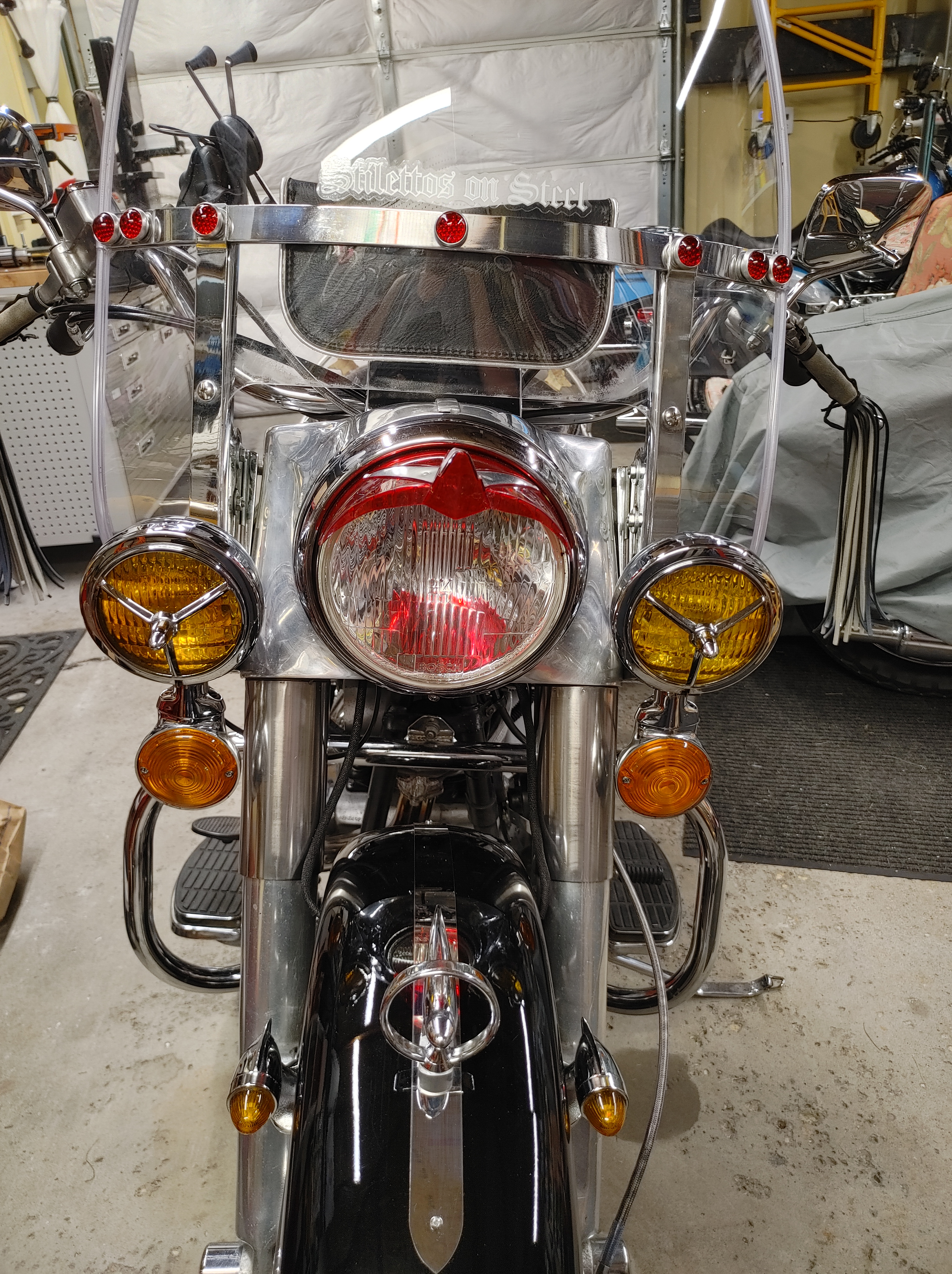 Long, hard fought couple of days finishing the bike completely. I needed different hardware to make the red jewels work on the windshield because the brackets are so thick. So I waited for that to come in. Yesterday I put the battery cover back on, and in so doing, found the power wire for my heated gear had shaken loose, so I fixed that. I tightened up the right rear turn signal. Then I got busy putting the jewels on the windshield. Surprisingly, that took HOURS!! The shovel was fighting me at every turn. Today I installed the front fender, wired the tailgunner lights in and tested them. Closed up the headlight again, wiped the bike down, and then made an insert for the top of the left saddlebag to hold a few more tools that I realized I needed. I packed and repacked the saddlebags to get the best use of space, and by some small miracle, there is room for everything. Mostly… Sooooo the Atomic Shovel is unofficially ready for the Utah run. I have to get it inspected, and do a couple more serious shakedown rides. Then it goes back for a final check on the motor rebuild, and I am ready to go. I will take better pics tomorrow in the sunlight, but these will do for tonight.