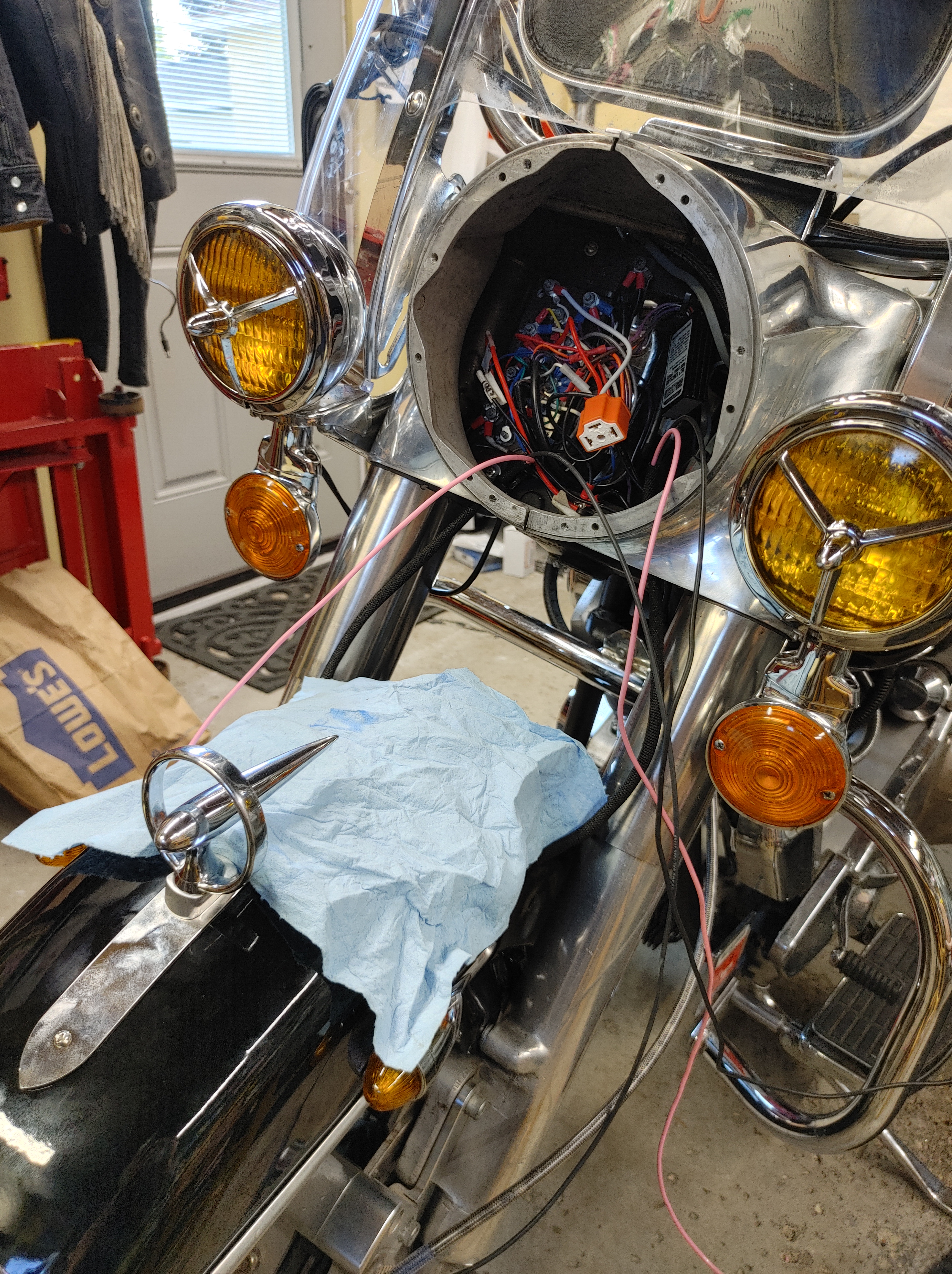 Shovel update: Yeah, still doing stuff. I realized yesterday that I’m going to be doing some night riding on my trip, which is great except the light in my speedo wasn’t working. So in true “me” fashion, I pulled the dash, and saw that the bulb had fallen out and was flopping around under the dash. It was a crappy light anyway, so I pulled the speedo, and fitted up some small LED bulbs in the spot where the “dim bulb” was supposed to go. Originally I was going to ground the lights to the dash, but I didn’t have a large enough ring terminal, so I decided to ground it to the speedo case. Which was a great idea till it didn’t work because the speedo is rubber mounted. Oops! So I had to find the right size ring terminal and redo it. This afternoon I finished it up and now I have a working light in my speedo! Hooray! Since I’m not sure exactly when, the horn has decided not to work. Not sure what’s up with that, but if I’m feeling cute, maybe I’ll chase it down later, idk.