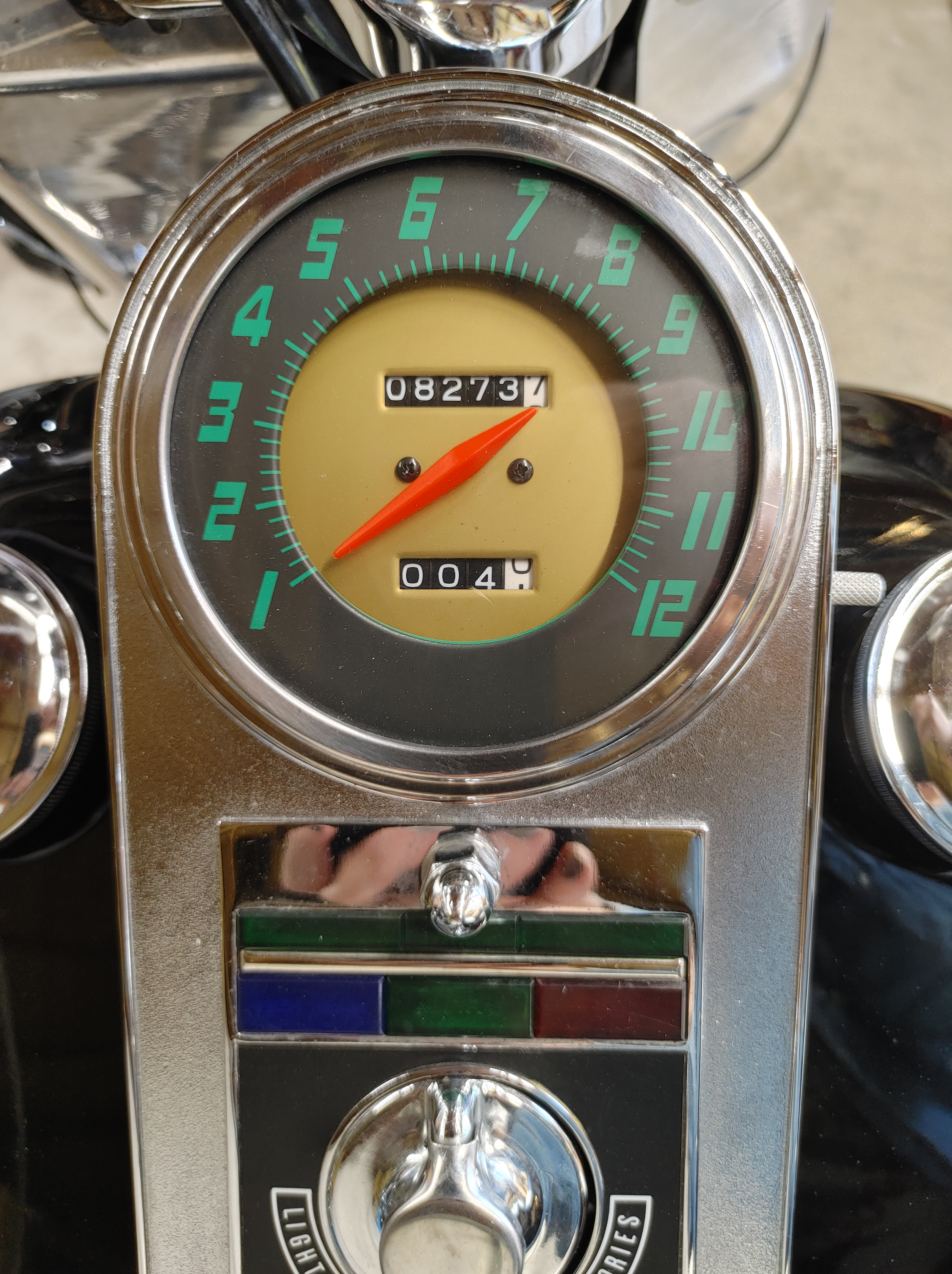SO chuffed! Rode out to visit my shovelhead mentor, had a nice chat, and headed home about 9:15. It was dark, so I could see how well the Speedo lights worked – I haven’t seen them lit up in complete darkness since I installed them last week. I also got to see how far my new headlight bulb reaches on low and high beam. Both were a win! The Speedo light is AWESOME!!! Far better than the original, and the way I put it together, the lights won’t be falling out of the Speedo and rattle around under the dash. The headlight, even on low beam has good reach, both out front, and side to side. The high beam is even better. I don’t do much riding after dark because of the very active deer population here. Doe party time starts about dusk, so I’m usually home and parked by then. But I wanted to make sure the shovel had effective lighting on it for the times when I do ride after dark. Nailed it. The Atomic Shovel rides at night.