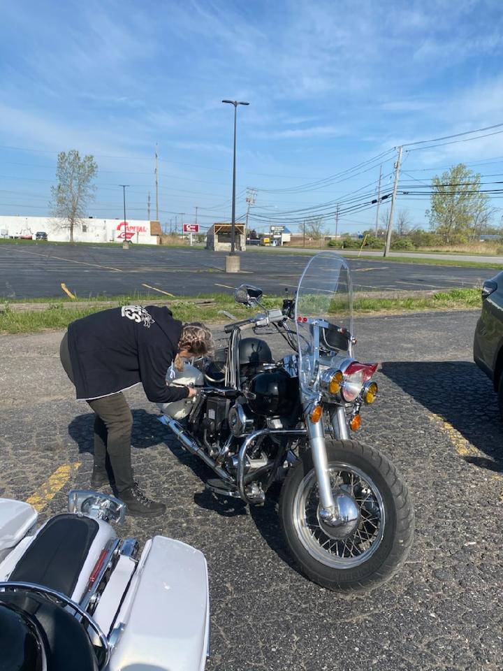 The day started out well. Ran into rain somewhere in NY near PA. By the time I could pull off to gear up, I was pretty well drenched, but I geared up and kept going. Later when I stopped for gas, I noticed way too much primary fluid all over the right side of my bike. I knew there was a very small crack in the cover, but I hadn’t had any issues till today. Of course. Further down the road, I started hearing chain noise. SO not good. And of course I was in wherethef*ckamiohio. I needed to get some kind of fluid in the primary like now. About 10 miles and I found a gas station. Got some oil and sure enough, there wasn’t much left in the primary. But now I am kinda freaked out. I can’t stop every 200 miles and fill the stupid primary, and I don’t want my new clutch and primary chain to go crash bang. So I posted for help on the AMCA page. Within minutes, Jason Wadzinski replied, and not long after, Marty Zavakos also replied. They live literally minutes from where I was staying, so once I got to the Dayton area, they were ready to give me a hand. I still had 230-some miles to get there, and while I was trying to staunch the bleeding, it started pouring rain again. I figured I would just ride till I heard chain noise again, but the bike held together just fine till I got to Jason’s place. Jason hauled my bike up on the lift, and Marty pulled the primary cover off. Thank god and all that is shovelhead, no damage to the chain, or the clutch. No evidence of any real issues, actually, so Marty used some special sauce on the gasket, buttoned it back up, and we are all keeping our fingers crossed that it holds! Big HUGE thanks to Jason and Marty!! Another long day tomorrow, but hopefully not quite so grueling.